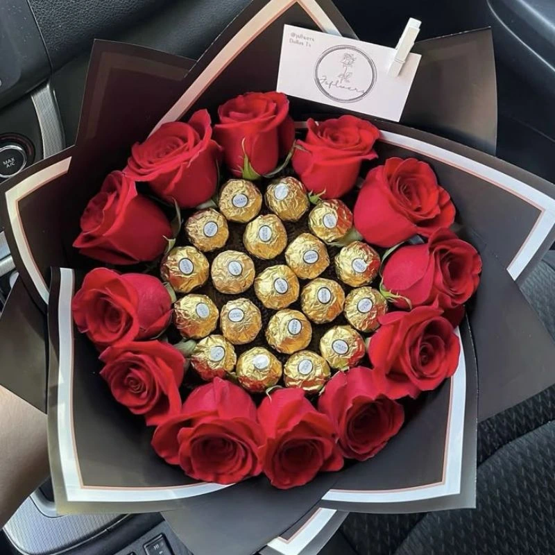 Une composition raffinée qui associe fleurs décoratives et chocolats, idéale pour offrir lors d’anniversaires et d’occasions spéciales.